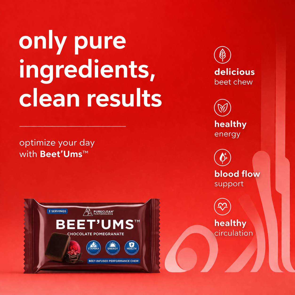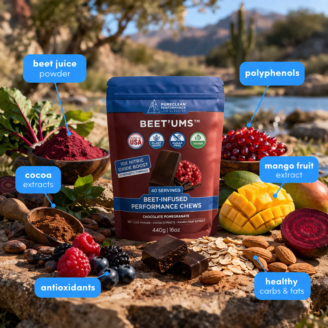 - BEET’UMS™ are a synergistic combination of premium fermented beet juice powder, cacao flavanols and healthy energy nutrients for all-angles natural endurance + health support.